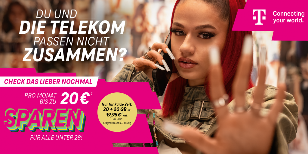 1) Monatlicher Grundpreis beträgt für Neukunden aktionsweise bei Buchung bis 30.04.2024 in den ersten 24 Monaten 24,95 € (ohne Smartphone), 39,95 € (mit Smartphone), 49,95 € (mit Top-Smartphone), 59,95 € (mit Premium-Smartphone) und 69,95 € (mit Premium-Plus-Smartphone), ab dem 25. Monat 39,95 € (ohne Smartphone), 49,95 € (mit Smartphone), 59,95 € (mit Top-Smartphone), 69,95 € (mit Premium-Smartphone) und 79,95 € (mit Premium-Plus- Smartphone). Mindestalter 18 Jahre, Höchstalter 27 Jahre. Ab dem Monat, der auf die Vollendung des 28. Lebensjahrs folgt, frühestens jedoch mit dem Ende der Mindestvertragslaufzeit, entfällt der Young Vorteil und MagentaMobil M Young wird zu den Konditionen des entsprechenden MagentaMobil Tarifs fortgeführt. Bereitstellungspreis 39,95 €. Mindestlaufzeit 24 Monate. Ab einem Datenvolumen von 40 GB wird die Bandbreite im jeweiligen Monat auf max. 64 KBit/s (Download) und 16 KBit/s (Upload) beschränkt. Ein Angebot von: Telekom Deutschland GmbH, Landgrabenweg 151, 53227 Bonn. 2) MagentaMobil Young Aktion bis zum 30.04.2024: Der monatliche Grundpreis reduziert sich für Neukunden um bis zu 25 €: z. B. im Tarif MagentaMobil M Young auf 24,95 €/Monat in den ersten 24 Monaten im Vergleich zu MagentaMobil M (49,95 €/Monat). Ab dem 25. Monat kostet der Tarif 29,95 €/Monat. Zusätzlich erhöht sich das Inklusivdatenvolumen von 40 GB auf 50 GB pro Monat für die Dauer der Mindestvertragslaufzeit. Mindestalter 18 Jahre, Höchstalter 27 Jahre. Der monatliche Grundpreis gilt nur bis zum Höchstalter von 27 Jahren. Ab dem Monat, der auf die Vollendung des 28. Lebensjahrs folgt, frühestens jedoch mit dem Ende der Mindestvertragslaufzeit, entfällt der Young Vorteil und der jeweilige MagentaMobil Young Tarif wird zu den Konditionen des entsprechenden MagentaMobil Tarifs fortgeführt. Bereitstellungspreis 39,95 €. Mindestlaufzeit 24 Monate. Ab Erreichen des Inklusivdatenvolumens wird die Bandbreite im jeweiligen Monat auf max. 64 KBit/s (Download) und 16 KBit/s (Upload) beschränkt.
