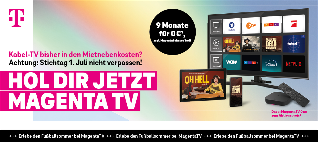 1) Aktion gilt bis 15.07.2024 für Breitband-Neukunden, deren Kabel-TV-Anschluss über die Mietnebenkosten abgerechnet wird und die zudem in den letzten 3 Monaten keinen Breitbandanschluss bei der Telekom hatten. MagentaZuhause S–XXL kosten in den ersten 6 Monaten jeweils 19,95 €/Monat. Danach kostet z. B. MagentaZuhause S 37,95 €/Monat. Der Aufpreis für z. B. MagentaTV Smart 2.0 beträgt in den ersten 9 Monaten 0 €, danach 10 €/Monat, ggf. zzgl. 5 €/Monat für die TV-Box MagentaTV One – in den ersten 9 Monaten 0 €. Hardware zzgl. 6,95 € Versandkosten. Einmaliger Bereitstellungspreis für neuen Telefonanschluss 69,95 €. Mindestvertragslaufzeit für MagentaZuhause und MagentaTV Smart 2.0 24 Monate, für Hardware 12 Monate. MagentaZuhause ist in fast allen Anschlussbereichen verfügbar. MagentaTV+ ersetzt die Megathek. Bei Nutzung über das Mobilfunk-Datennetz erfolgt die Belastung des Datenvolumens beim jeweiligen Mobilfunk-Anbieter. 2) Streaming-Dienste erfordern je nach Tarif einen separaten Vertrag. Ein Angebot von: Telekom Deutschland GmbH, Landgrabenweg 151, 53227 Bonn.